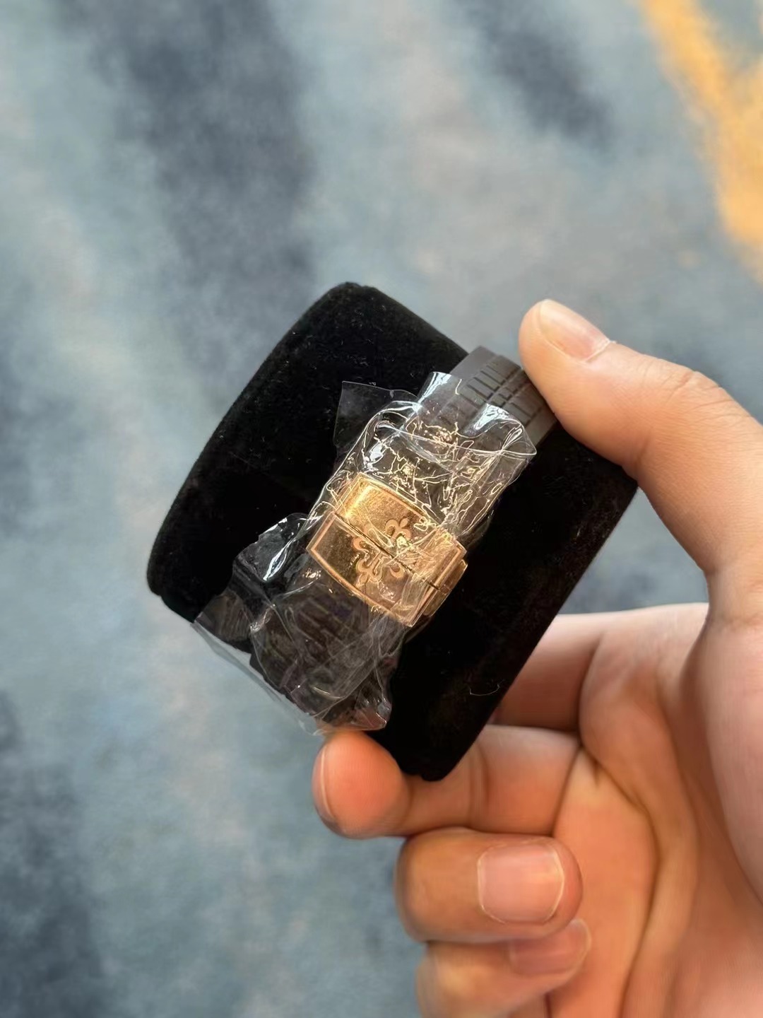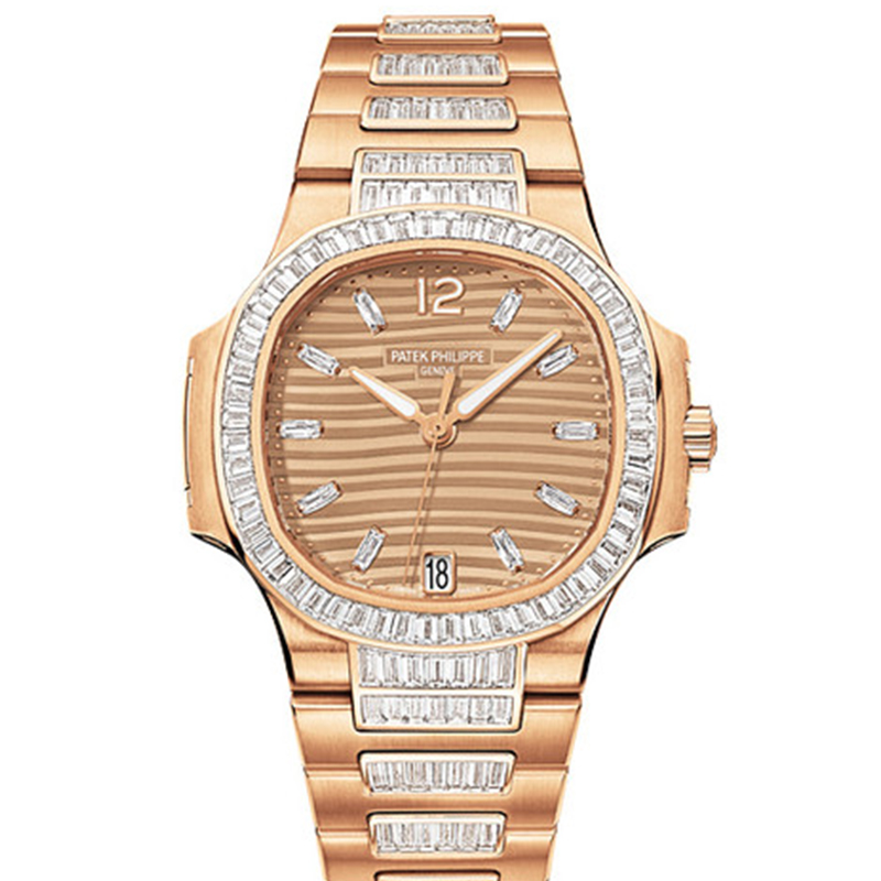 表盘材质:棕色日辉纹表盘,边缘呈黑色渐变效果,饰有Aquanaut浮雕图案,搭配覆白色荧光涂层的金质立体字块。