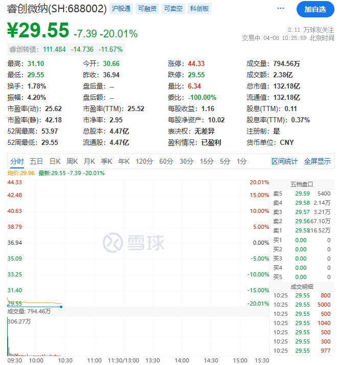 今日盘前,海能达发布关于重大诉讼的进展公告。海能达于近期收到美国法院的判令,临时禁止该公司在全球范围内销售双向无线电技术的产品,并处以每天100万美元的罚款,直至公司完全遵守禁诉令之时止。 该次案件起源于公司与摩托罗拉的商业秘密及版权侵权诉讼案件。海能达表示,公司已撤销深圳案件的起诉,同时按要求暂停销售双向无线电技术产品,并已向美国法院申请撤销上述判令,近日正在美国法院持续进行听证。公司将进一步采取各项应对措施,争取最短时间撤销上述判令。 实控人被留置 睿创微纳20CM跌停 4月8日上午,睿创微纳低开17%,开盘后迅速走出20CM跌停,截至发稿仍未开板。