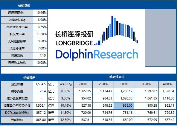 从绝对估值的角度,假设 WACC=10.5%,永续增长率 3% 的情况下 DCF 测算出的老铺黄金的股价为 958 港币,也就溢价了 8%。