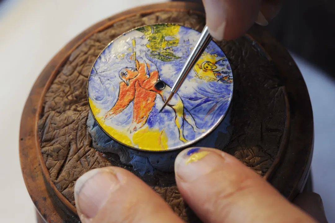 在珐琅彩绘中,微绘珐琅是一门极为精巧的技艺,也是所有珐琅技法中难度最大的。微绘珐琅的挑战性不仅在于更要根据原作的光影和色彩调配出丰富而微妙的釉彩,要将原本正常甚至巨幅尺寸的画作微缩绘画在方寸表盘之上,更在于珐琅艺术大师需要时刻敏锐地把握其颜色和光泽的变化。
